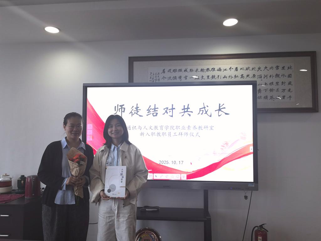为进一步提升学院教师队伍的整体素质,加速青年教师的专业成长,充分发挥资深教师“传、帮、带”作用,2025年10月17日,通识与人文教育学院职业素养教研室在明德楼713会议室举行新进教职员工拜师仪式。新进教师吴笛向思想导师吴峥老师和业务导师简杰老师献花,吴峥老师和简杰老...