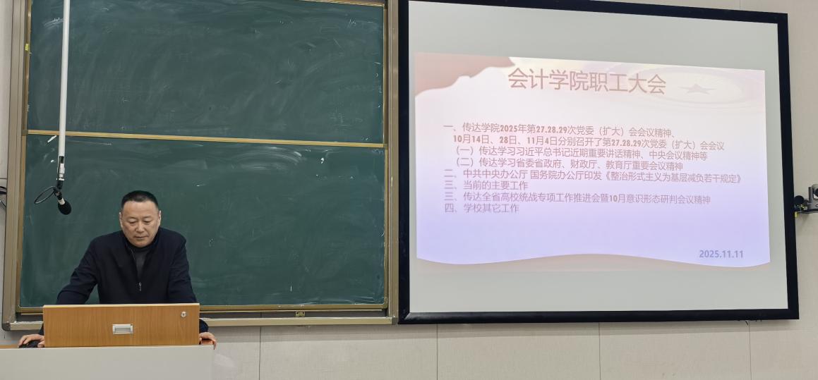 2025年11月11日,四川财经职业学院会计学院在至诚楼B110教室召开学年第九次全体党员教职工大会。会议由学院党总支书记杨晓荣主持,全体党员教职员工齐聚一堂,集中学习重要精神、部署重点工作,凝聚起推动学院事业再上新台阶的奋进力量。会议系统传达学习系列重要精神与文件要...