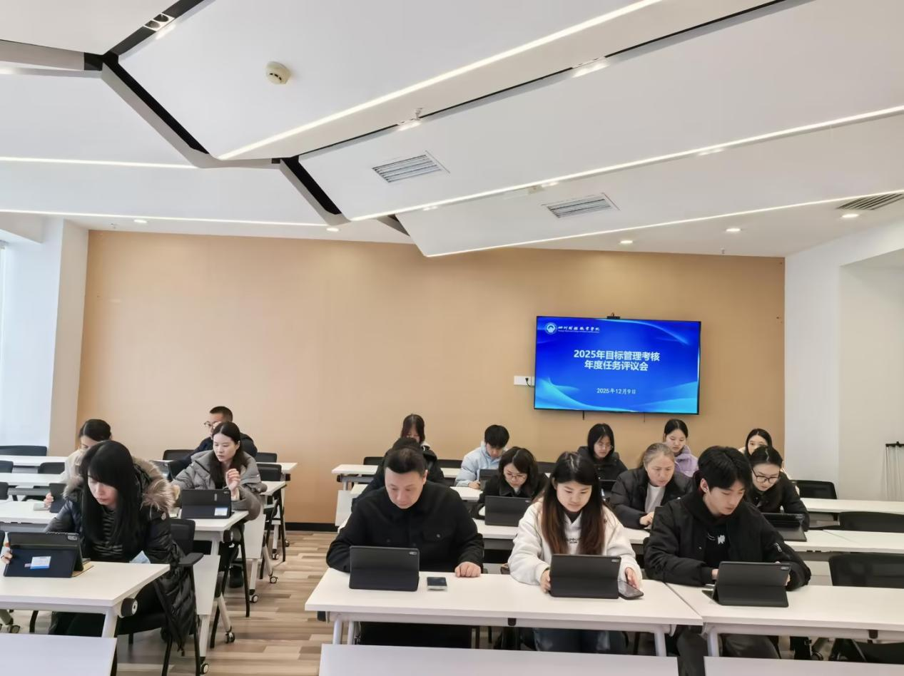 2025年12月9日下午2:00,四川财经职业学院目标管理年度任务评议会在明德楼406会议室召开。学校20名教师代表和学生代表参加评议。会上,党政办公室科长张越强调了目标管理考核的重要意义,详细介绍了年度评议工作的评分要求和评分标准。教师代表、学生代表认真查阅了28个部门的...