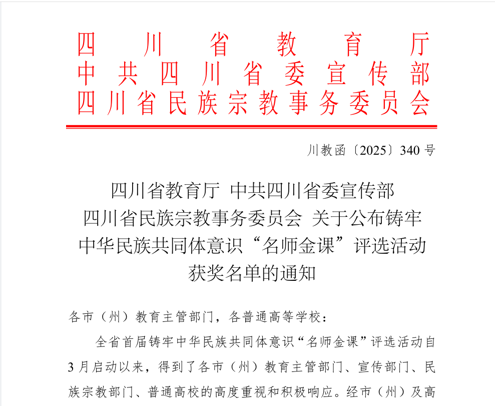 近日,四川省教育厅、中共四川省委宣传部、四川省民族宗教事务委员会联合发布《关于公布铸牢中华民族共同体意识“名师金课”评选活动获奖名单的通知》(川教函〔2025〕340号)。我校在此次评选活动中表现优异,荣获一等奖1项、二等奖1项。此次评选活动是四川省首次举办的铸牢中华民族共同体意识教育...