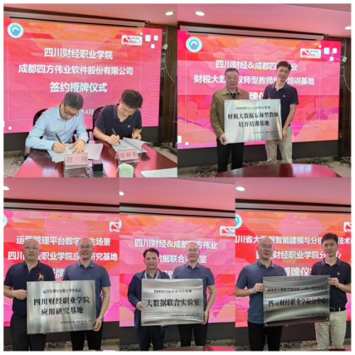 签约仪式上,双方签订了《产教融合框架协议》;学院向成都四方伟业授予了“四川财经&成都四方伟业财税大数据双师型教师培育培训基地”牌匾;成都四方伟业向学院授予“四川省大数据智能建模与分析工程技术研究四川财经职业学院分中心”“运营管理平台数字孪生场景四川财经职业学院应用研究基地”“四川财经&成都四方伟业大数据联合实验室”牌匾。