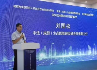 学院副院长(主持行政工作)符刚,东安街道党工委副书记、办事处主任吴震,龙泉驿区外商投促中心副主任(中法生态园管委会班子成员)杜成立出席仪式并签署校地园区合作协议书。区委组织部、区委社治委、区教育局相关领导受邀出席仪式,见证合作签约。学院党委委员、副院长罗潇及部分中层干部,东安街道党政领导班子成员,中法(成都)生态园管理委员会领导班子成员参加仪式。