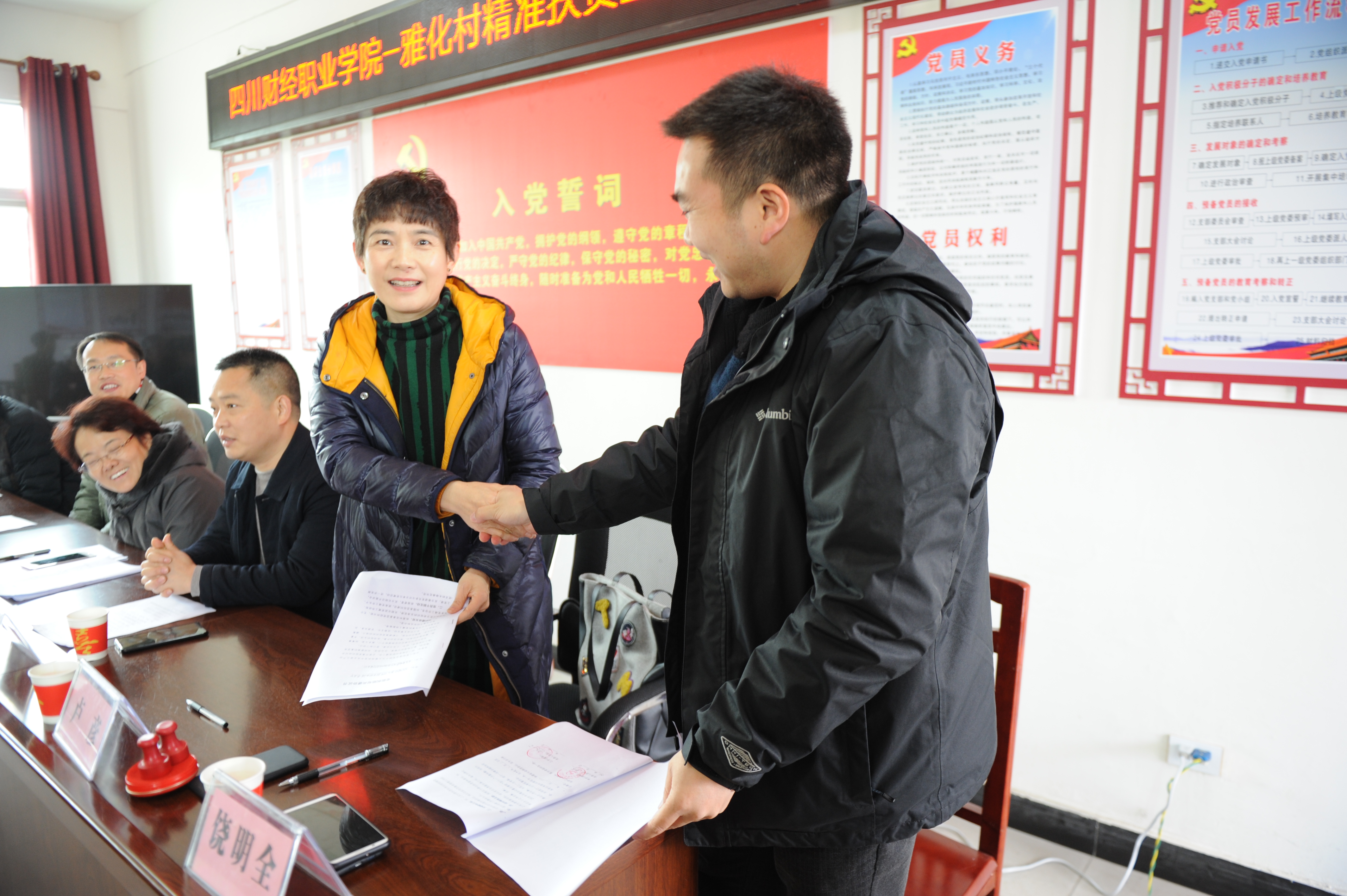 在雅化村会议室召开的精准扶贫暨党建共建座谈交流会上,黄吉秀谈到:“物质贫困不可怕,可怕的是我们思想上懒惰、贫穷,更可怕的是让后辈感到悲观和再贫穷。我们扶贫绝对不能让下一代再贫穷,不能让每一位贫困孩子读不起书!这两年,学院坚持扶贫与扶志扶智相结合,针对雅化村贫困学生设立了专项教育资助金,资助150余人次贫困学生近10万元;还专门开办留守儿童‘博雅课堂’20余期培训500余人次,安排留守儿童‘成都上大学’。”她还表示:“学院的对雅化村的扶贫早已从组织安排责任转化成了情感牵挂。雅化村脱贫后,学院对雅化村的扶贫力度不减,进一步细化帮扶措施,拓展‘博雅课堂’新形式、开辟教育扶贫新模式”。雅化村1组贫困龙世中交流发言到:“我们现在的日子真的很知足了,房子改造了、低保享受了、孙儿读书减免学费,财经学院还每年资助他,真的是说不完的恩情啊”。村党支部副书记丁云银说:“省财经学院这几年不仅为我们村带项目、带资金两千多万元,还派来了一位好书记,带领我们抓党建、搞建设、促脱贫,每一件事都是我们雅化村的幸运啊”。交流会上,四川财经职业学院招生就业处党支部书记卢彦与雅化村第一书记、党支部书记饶明全(四川财经职业学院学工部副部长)签订了《党组织结对共建协议书》。