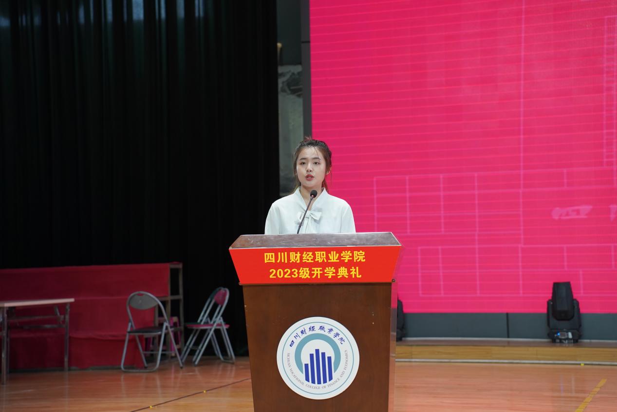 2023级电子商务1班马晶晶作为新生代表发言,她表示会尽快适应大学生活,尊敬师长、团结同学,与勤奋为伴,投身专业实践,争当新时代好青年。
