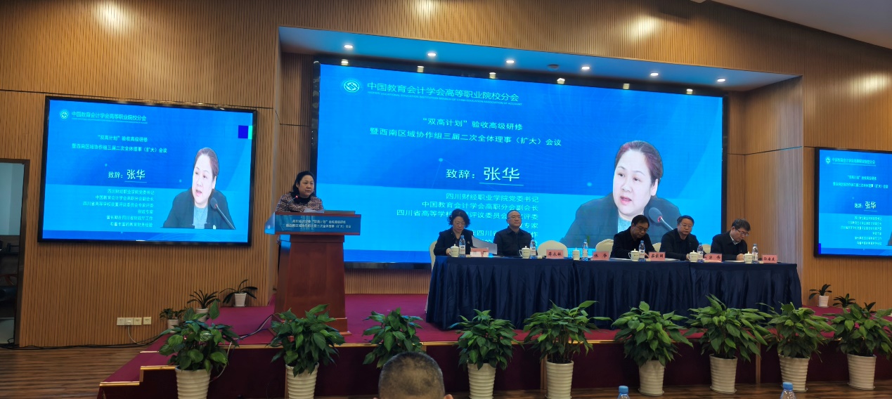 高职会计分会副会长兼西南区域协作组组长、四川财经职业学院党委书记张华致辞并传达中国教育会计学会2023年第二次会长扩大会、高职会计分会三届六次常务理事会精神,并要求西南协作组把分会“好”的成果传播开来,把分会“实”的作风传承下去,把分会“家”的温暖传递四方。