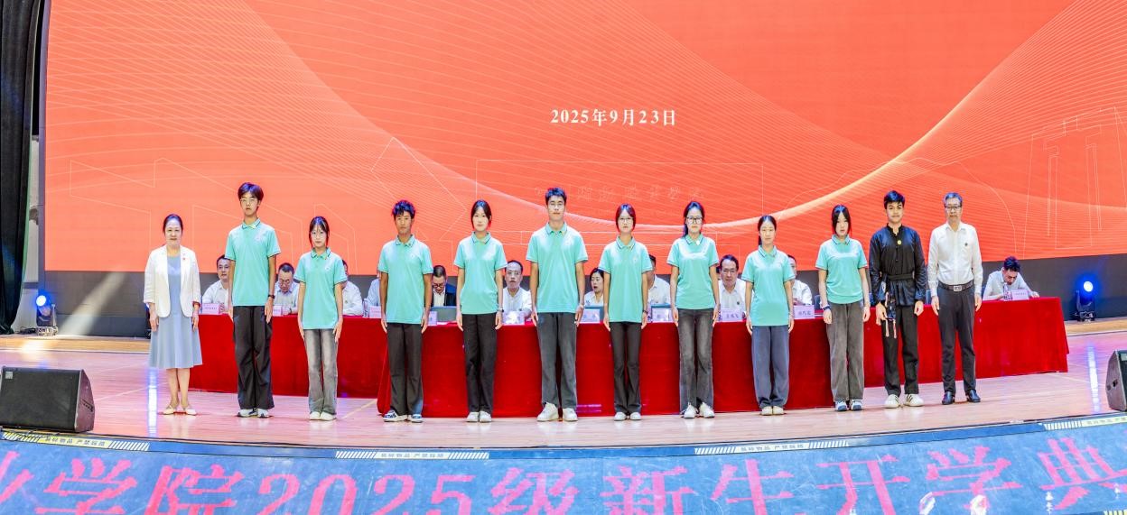 典礼上,张华、符刚为2025级新生代表佩戴校徽、赠送书籍。典礼最后,全体在场师生共唱校歌《光荣与梦想》,为此次开学典礼画上圆满句号。