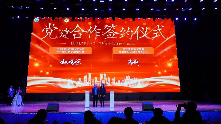 12月2日晚,学校第九届“诚信悦动·青春同行”诚信文化节闭幕式颁奖晚会暨党建联建校企合作签约仪式在学校体育馆圆满落幕。学校党委书记张华,党委委员、副院长罗潇、李代俊,苏宁易购集团苏宁成都党支部书记李莉,四川大华思迈税务师事务所有限公司总经理汤莉,以及相关企业负责人和职能部门负责人一同参加本次晚会。