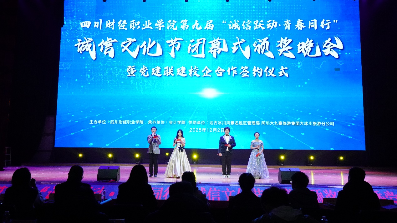 晚会现场,四川苏宁易购销售有限公司与学院签署了党建联建与校企合作协议,标志着我校校企协同育人迈出坚实新步伐。节目精彩纷呈,歌伴舞《说到做到》、小品《一诺千金》、舞蹈《珠腾算舞》等九个节目,以丰富的内容诠释了诚信内涵,充分展现了川财学子的风采与活力。活动期间,嘉宾为征文、海报设计、案例分享、微电影等系列比赛的获奖者颁发了荣誉证书。