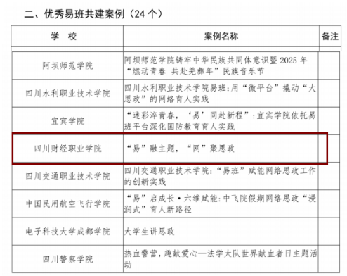 近日,四川省教育厅易班建设与发展中心公布了2025年度四川省易班共建高校评优结果。我校党委学生工作部报送的工作案例《“易”融主题,“网”聚思政》荣获省级“优秀易班共建案例”;指导教师张毛宁荣获省级“优秀易班指导教师”。