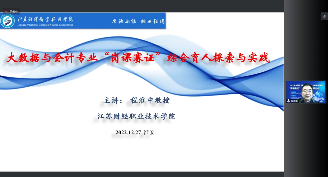 高质量发展会计必须依赖“岗课赛证”高质量融通,江苏财经职业技术学院校长程淮中教授在作《大数据与会计专业“岗课赛证”综合育人探索与实践》的主题报告时如此强调。程淮中教授从数字化赋能专业升级、大数据时代对会计行业(教育)的影响、“岗课赛证”融通的内涵与价值取向、“岗课赛证”融通课程体系的重构、“岗课赛证”融通育人的创新实践四个方面详细介绍“岗课赛证”融通育人的具体实施路径。