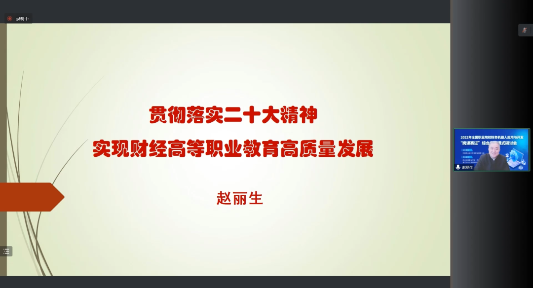 中国商业会计学会职业教育分会会长赵丽生教授就《贯彻落实党的二十大精神,实现财经高等职业教育高质量发展》作主题报告。赵丽生教授先解读了党的二十大报告、关于深化现代职业教育体系建设改革的意见等政策中关于职业教育的内容。最后在关于岗课赛证中,他强调了职业教育实际上就是岗位需求教育,岗位是目标导向、需求导向。