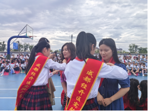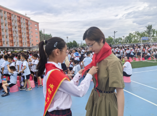 随后,经开区实验小学学生还为3位老师系上了红领巾,展示出了他们对四川财经职业学院老师和同学参与本次儿童节汇演的感激与欢迎。