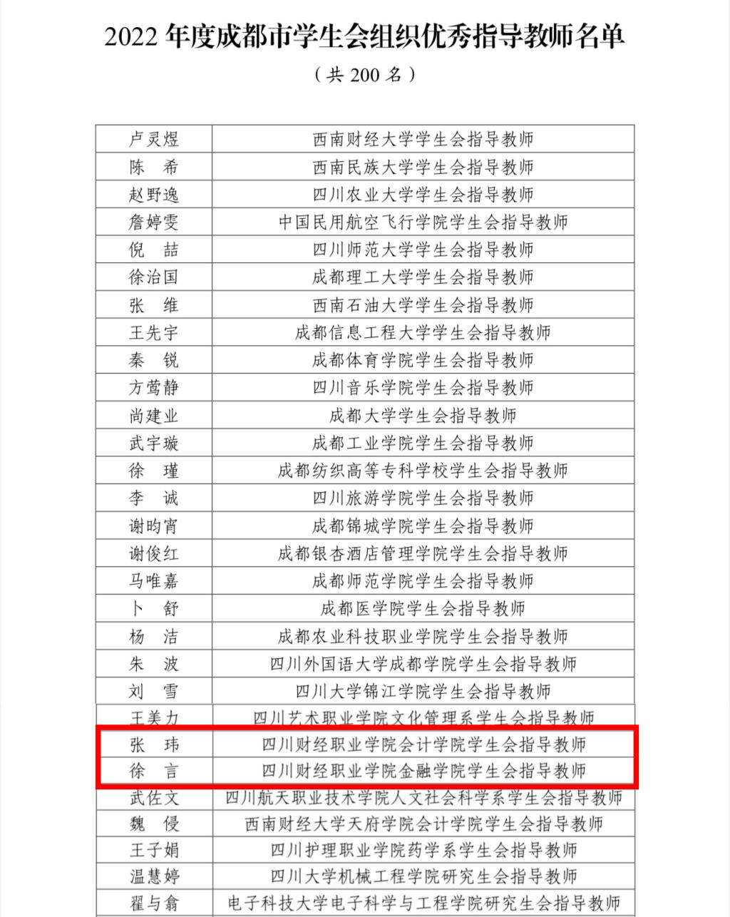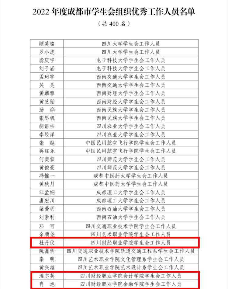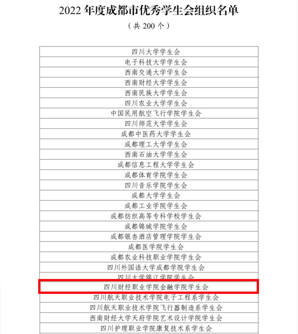为继续加强团市委和市学联对学生会组织的指导管理,支持学生会组织更好地服务青年学生成长成才,充分发挥先进典型示范作用,进一步引导学生会组织参与和融入青年发展型城市建设。近日,成都团市委、市学联联合开展了2022年度成都市优秀学生会组织、成都市学生会组织优秀指导教师、成都市学生会组织优秀工作人员的评选工作。我校金融学院学生会荣获“成都市优秀学生会组织”称号;我校会计学院学生会指导老师张玮老师、金融学院学生会指导老师徐言老师荣获“成都市学生会组织优秀指导教师”称号;四川财经职业学院学生会工作人员杜丹仪、金融学院学生会工作人员肖旭、会计学院学生会工作人员温志英三位同学荣获“成都市优秀学生会组织工作人员”称号。