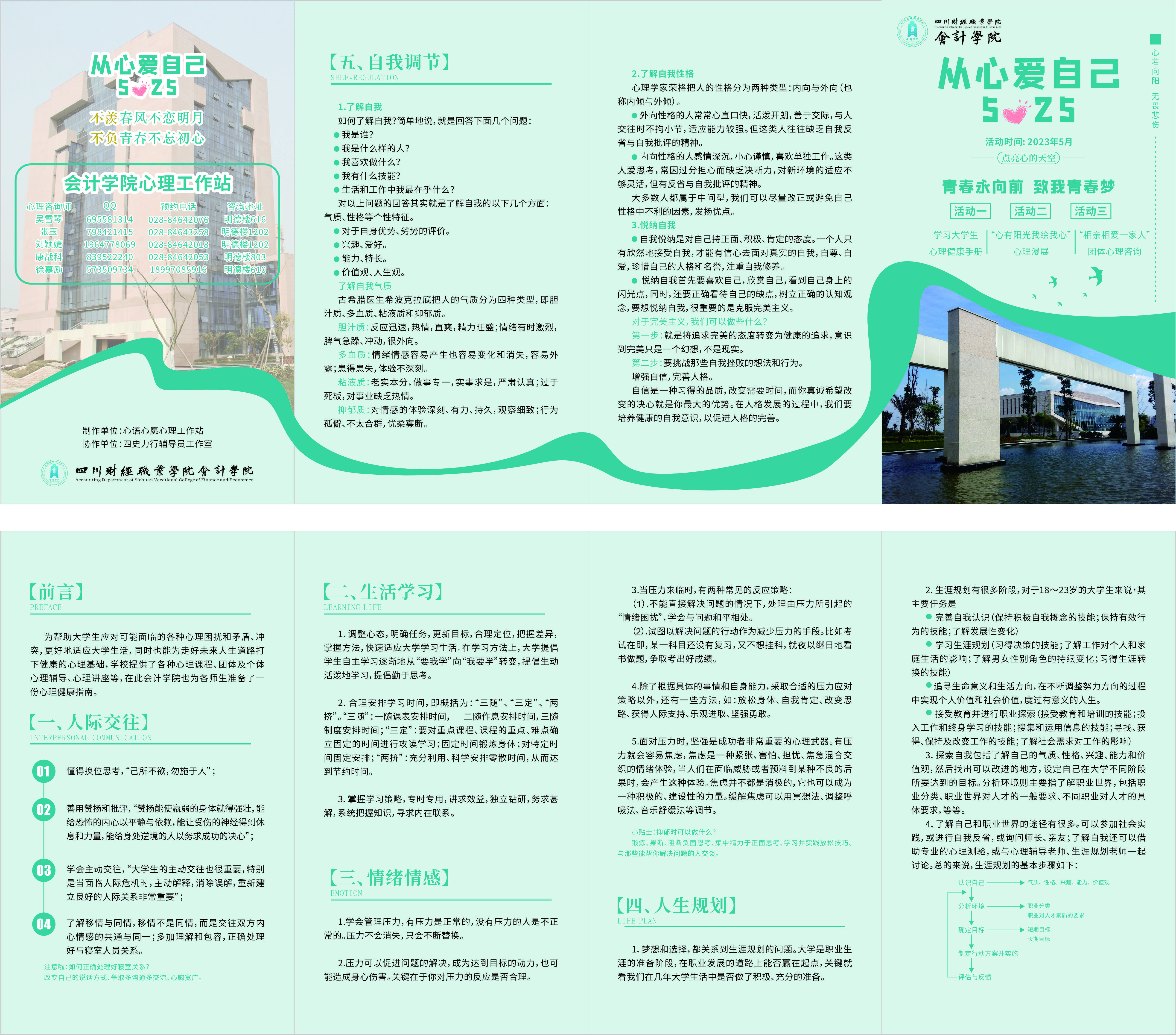 5﹒25译为我爱我,给心灵一片晴空。2023年5月25日,伴随着我国第13个大学生心理健康月的到来,四川财经职业学院会计学院心语心愿心理工作站与会计学院青协联合举办了一系列精彩纷呈的心理健康活动,在广大学生中传播心理健康知识,提高大学生心理健康卫生意识。