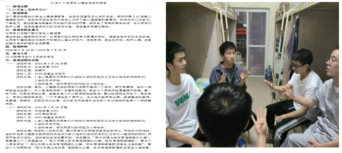本次活动主要包括学习心理健康教育手册、心理漫展、寝室团体心理咨询三个活动。