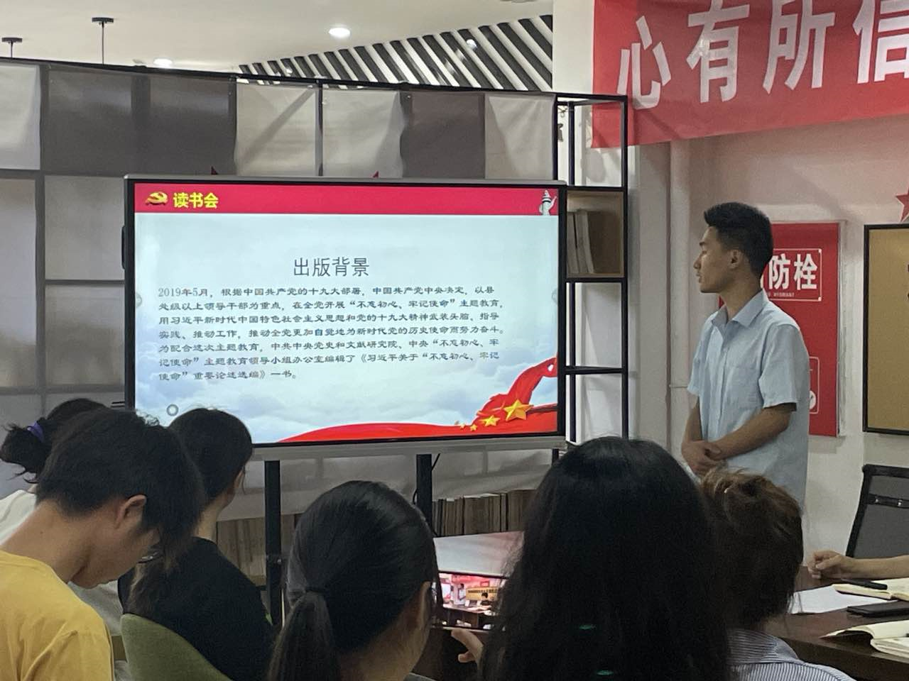读书会的张龙同学和余牡烟同学分别分享《习近平关于“不忘初心、牢记使命”重要论述选编》和《苦难辉煌》两本书籍。张龙同学主要介绍了书籍的出版背景和自己的感悟。张龙同学表示,虽然习近平总书记关于“不忘初心、牢记使命”的重要论述自己还不能够很深入理解,但在学习中切实感受到总书记伟大的前瞻性以及论述内容对自己的激励性。余牡烟同学分享金一南将军的著作《苦难辉煌》,从金一南将军的生平到书籍中的选段分享,余牡烟同学建议可以从伟人传记、著作里感受党的奋斗历程,帮助大家更为生动理解伟大建党精神。