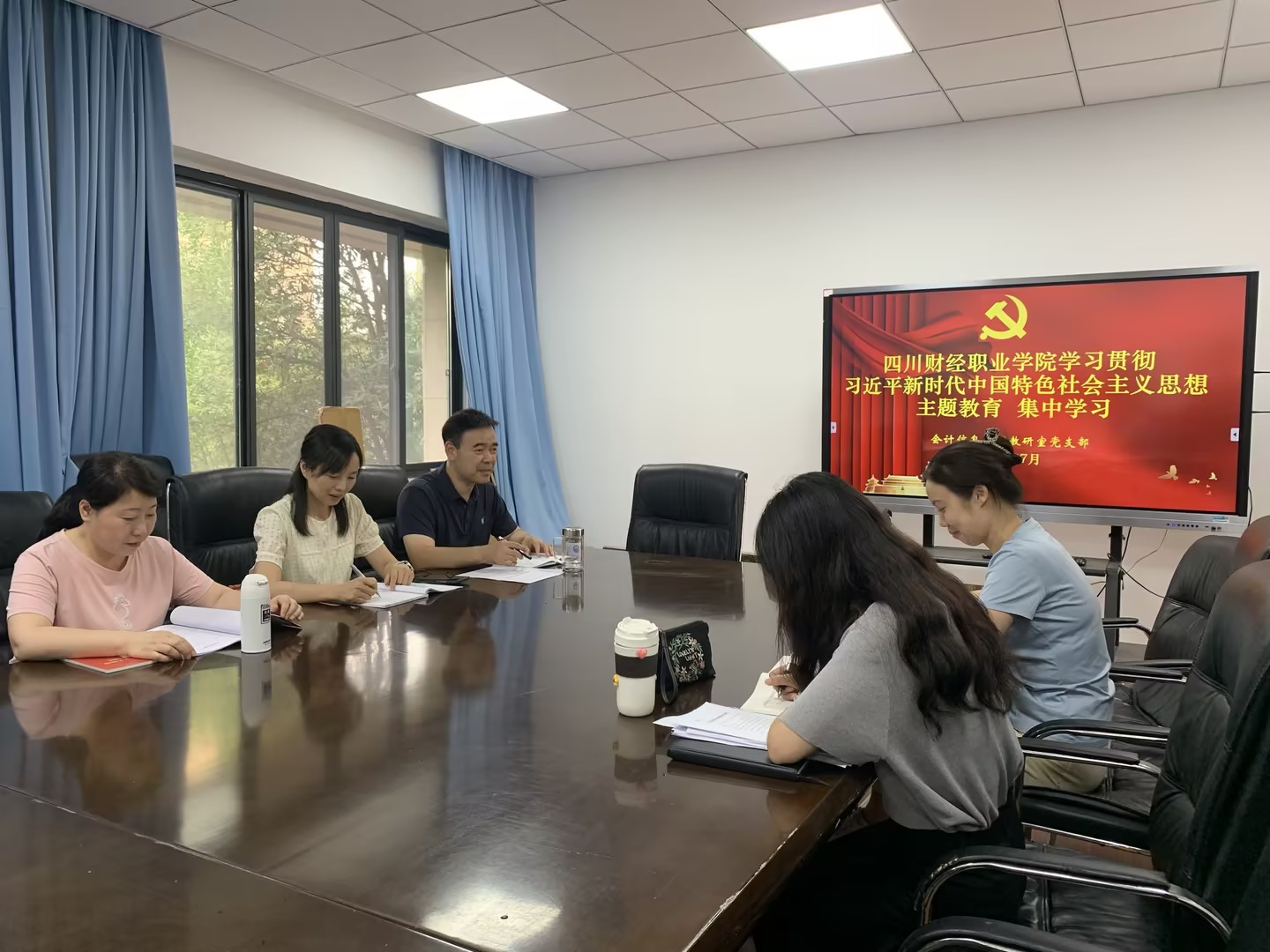 为深入开展学习贯彻习近平新时代中国特色社会主义思想主题教育,营造浓厚学习氛围,7月7日上午,会计信息教研室党支部召开“应知应会知识”专题学习会。本次学习活动共有5名正式党员、1名入党积极分子,以集体研读、分组讨论的形式进行学习。