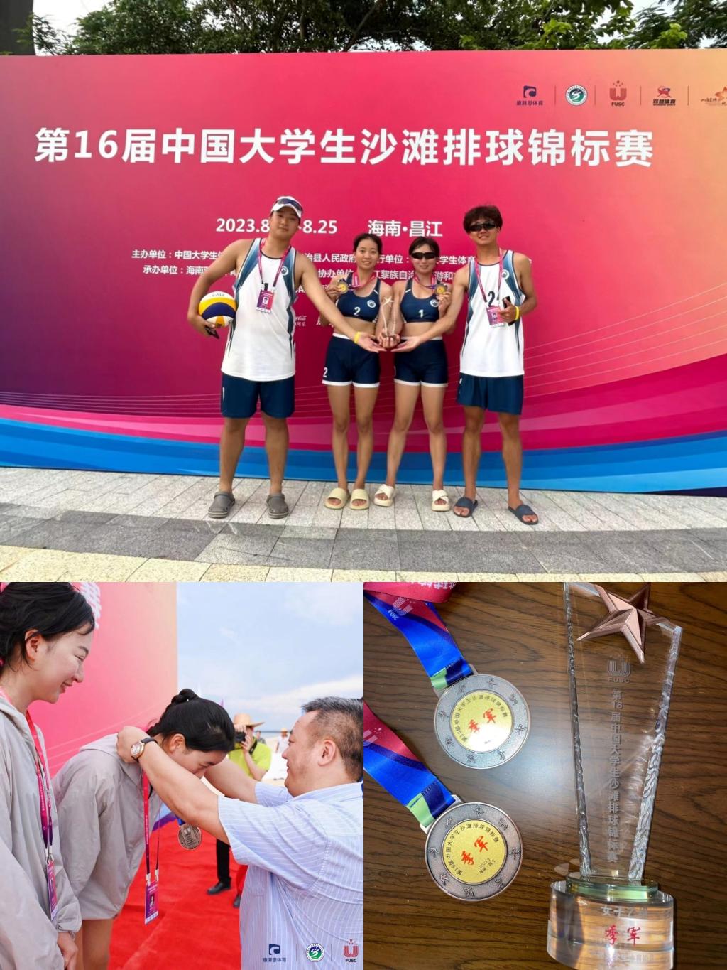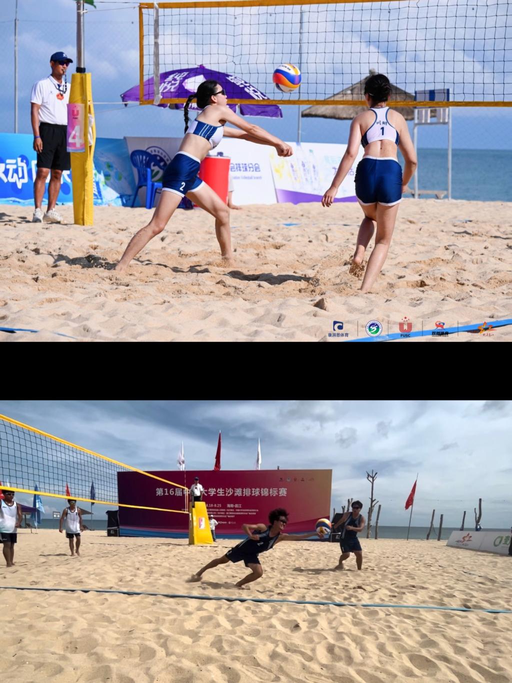 2023年8月18日--25日,由中国大学生体育协会举办的“第16届中国大学生沙滩排球锦标赛”在海南昌江黎族自治县棋子湾沙滩排球场举行。本次比赛分为甲乙丙丁不同组别,共有来自全国的52所高校98支队伍参加本次比赛。我院排球队共派出两只队伍,由通识与人文教育学院体育教研室教师张健、林凯带队,分别报名参加了男子乙组和女子乙组的比赛,并通过顽强拼搏获得女子乙组全国第三名,以及男子乙组第五名。