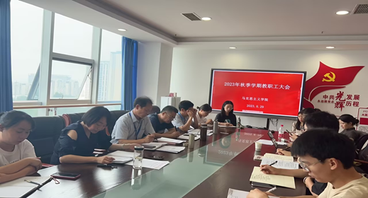 会上,胡恒丽院长传达了秋季学期学校干部大会精神和相关要求,并就秋季学期马克思主义学院工作做了安排。在大思政课师资资源库建设、课程教学、课程建设、教师培训工作、科研工作、预算执行、社会服务等方面提出了本学期的工作任务和要求。强调马克思主义学院的教育教学工作必须坚持立德树人,坚持“大思政课”引领,各教研室要认真召开教研会,探讨课内实践活动向全校型活动转型,在教学中要关注课堂底线,树立课堂高线;要求全体老师依靠学院研究平台做好个人科研规划和发展;最后再次强调了教学和工作纪律。