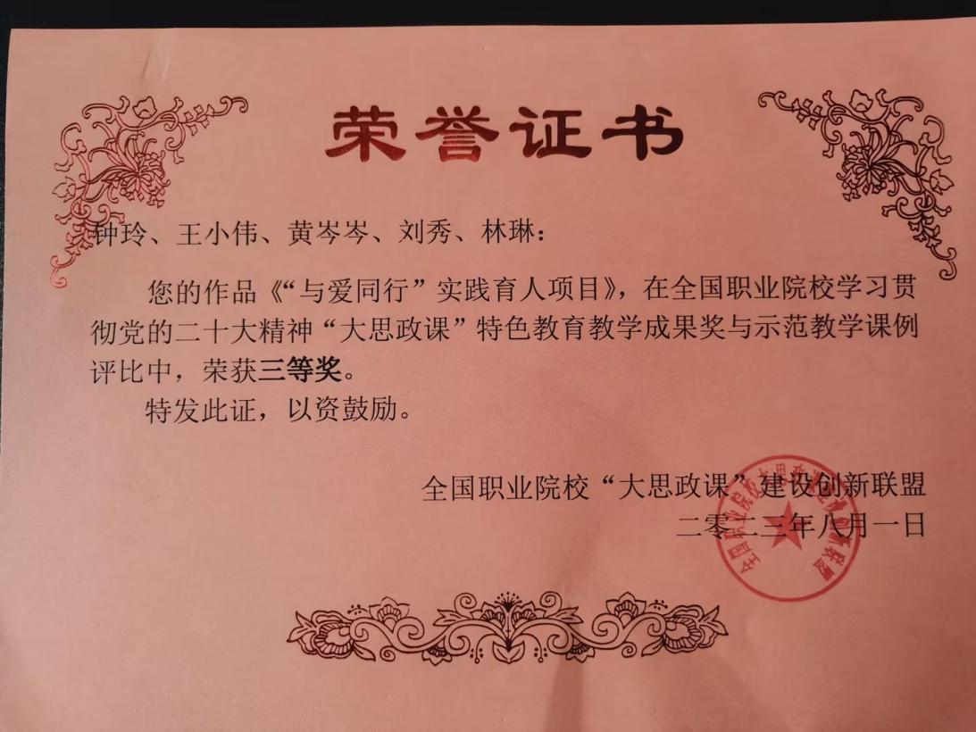 近日,全国职业院校学习贯彻党的二十大精神“大思政课”特色教育教学成果奖与示范教学课例评选结果公示,马克思主义学院董文、胡恒丽、崔维清申报的《“大思政课 ”引领进四结合五推进 提升党的二十大精神学习实效——<形势与政策>课堂革命典型案例》,钟玲、王小伟、黄岑岑、刘秀、林琳申报的《“与爱同行”实践育人项目》均荣获三等奖。