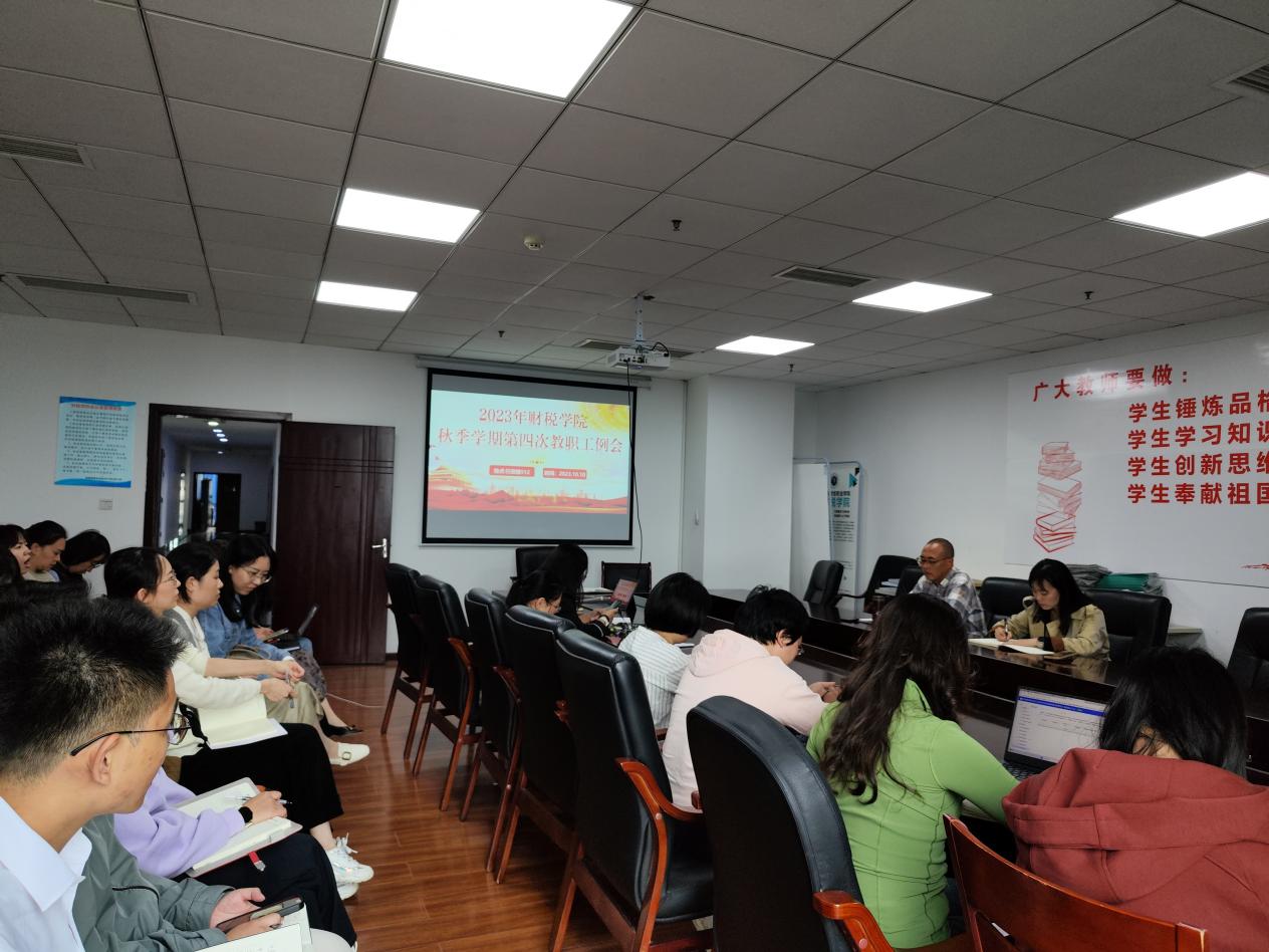 2023年10月10日下午,财税学院全体教职工在行政楼512会议室召开本学期第四次教职工会,本次会议主题为传达领导学院党委主题教育会议精神,解读教育教学工作重点,安排近期学院任务,提高教学成效和凝练教学特色。会议由财税学院院长祝刚主持并讲话,副院长罗艾,党总支副书记陈露发言。