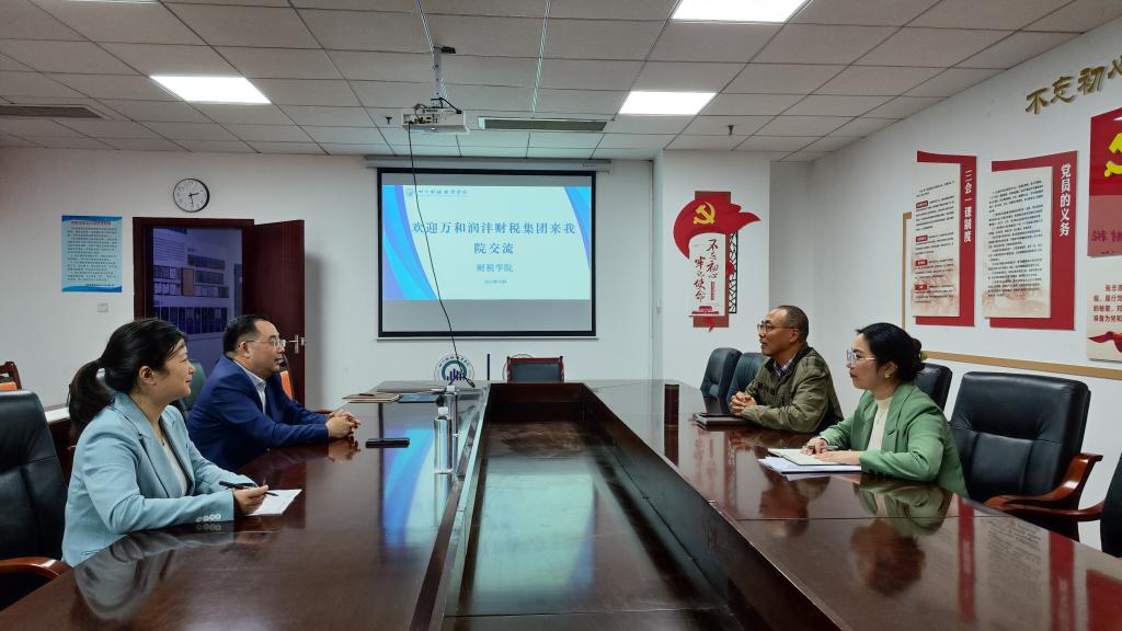 10月26日下午,万和润沣财税集团董事长毛熠,副总经理胡庆玲一行到四川财经职业学院财税学院做大数据税务专业检索平台交流,财税学院院长祝刚,财税大数据应用教研室主任蒋莉蘋参与交流。