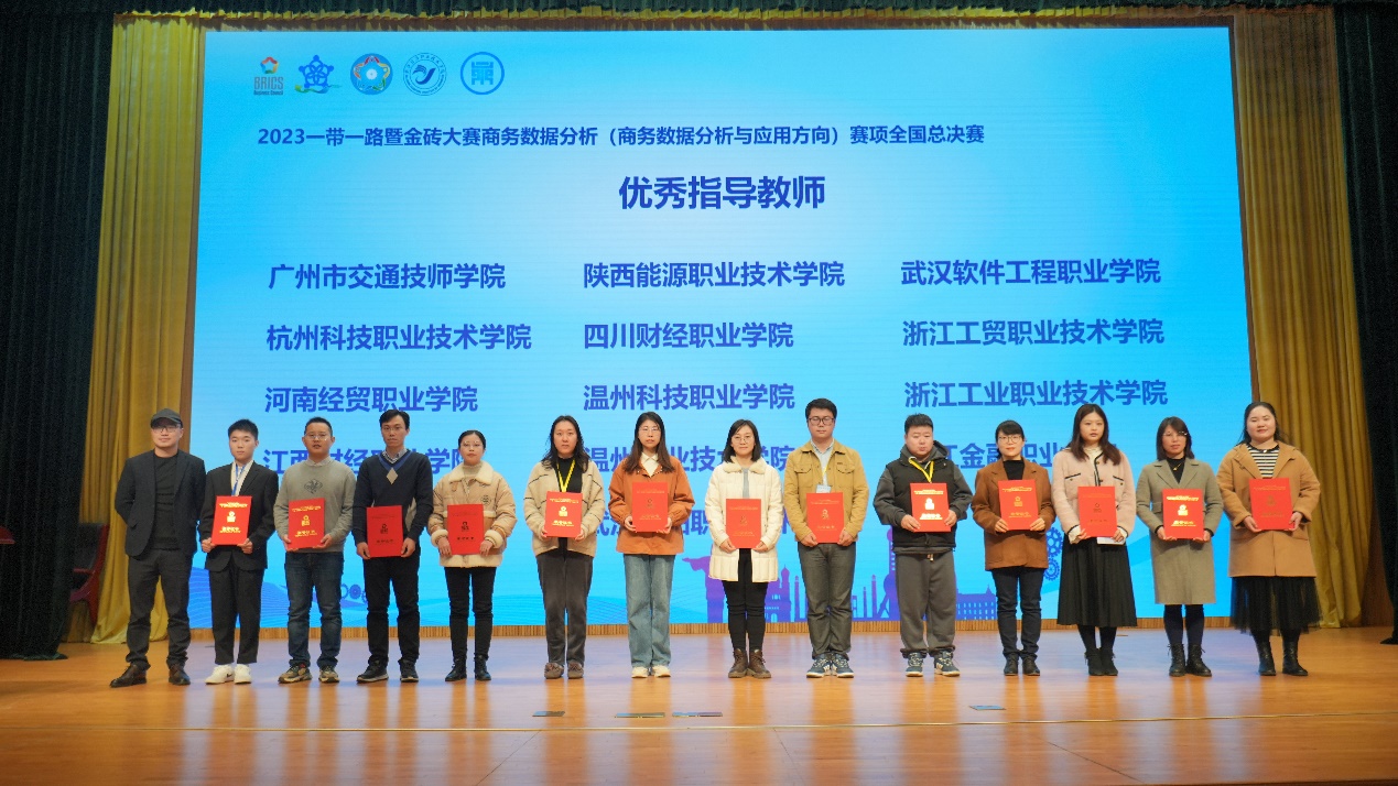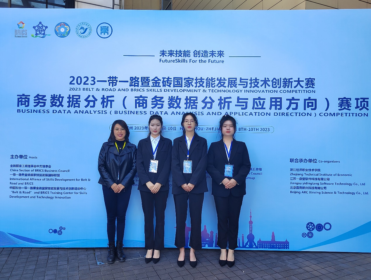 金砖国家工商理事会中方理事会主办的“2023一带一路暨金砖国家技能与技术创新大赛之商务数据分析(商务数据分析与应用方向)赛项”全国总决赛于12月8-10日在浙江杭州举行。由信息学院唐雨薇、陈怡桉老师指导的商务数据分析与应用专业参赛选手(学生:吕芳、范燕妮、李帮琪)从省赛选拔赛300多支队伍中脱颖而出,最终获得全国二等奖,四川财经职业学院获得优秀组织奖,陈怡桉、唐雨薇老师获得优秀指导教师奖。