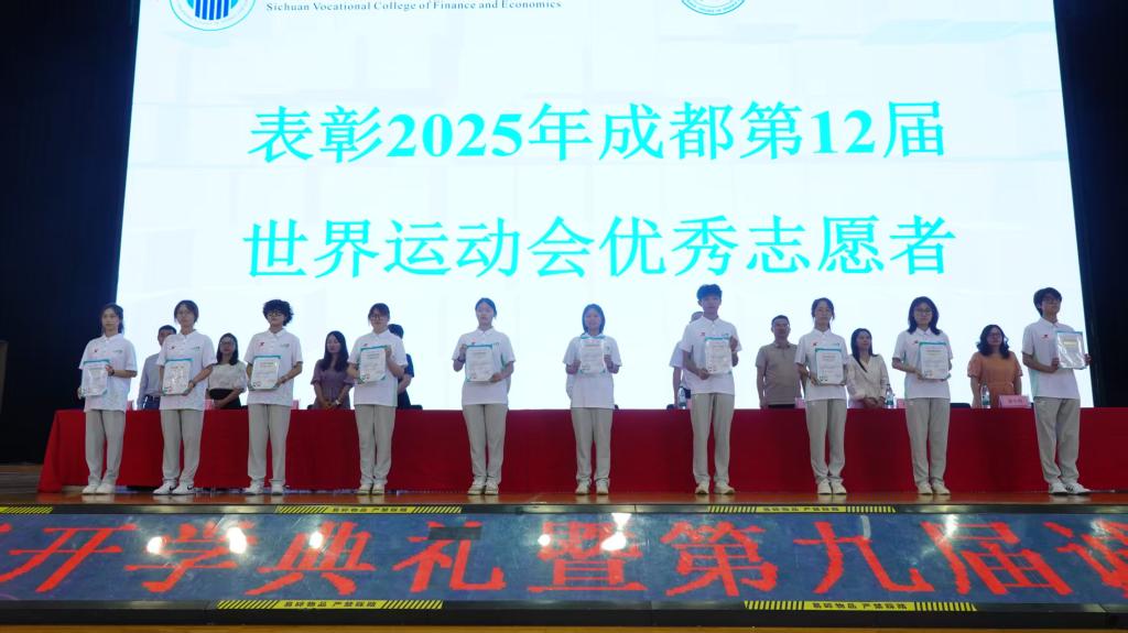 仪式上,学院对2025年成都世界运动会优秀志愿者进行了表彰,并举行了新生代表佩戴院徽仪式。