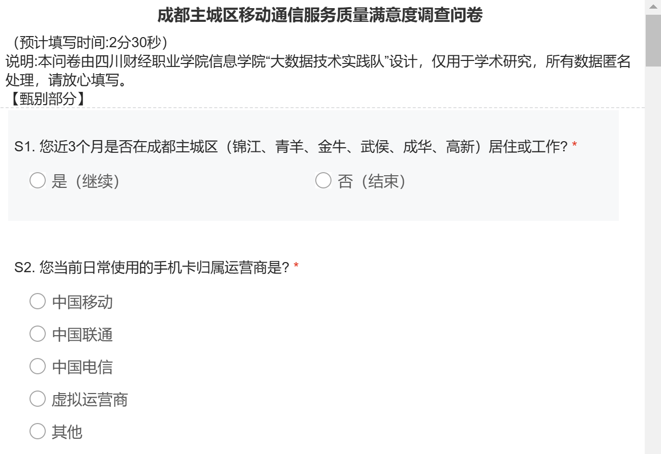 团队提前对接四川移动网优中心,将“通话掉话、5G驻留、千兆宽带测速、客服响应”4类常见投诉拆成22个量化指标,采用5级李克特量表,并加入“年龄段、常用套餐、常驻商圈”3项标签变量,便于后期交叉分析。问卷电子化处理,生成二维码,平均填答时长控制在2分40秒。