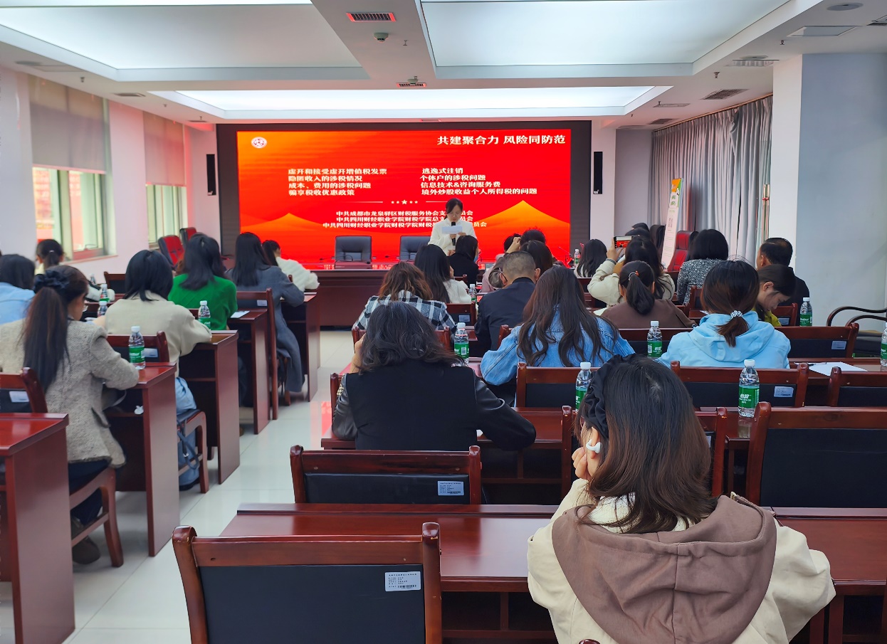 在税收监管持续强化的背景下,为深化党建与业务融合,2025年10月29日,中共四川财经职业学院财税学院总支部委员会、财税教研室支部委员会与中共成都市龙泉驿区财税服务协会支部委员会联合举办“共建聚合力,风险同防范”主题党日活动。活动地点在龙泉驿区政务中心412会议室举行,三方党员及协会代表共50余人参与。