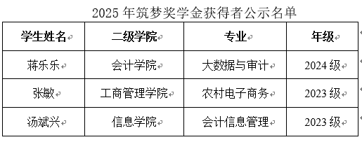 根据《关于做好2025年筑梦奖学金评审工作的通知》(川财职院学工〔2025〕99 号),经学生本人申请,二级学院审核推荐,学生资助管理中心组织复核评审,我校2025年筑梦奖学金拟推荐候选人共3名学生。名单予以公示,公示期为11月4日——11月10日,如有异议,请联系学生资助管理中心(学工部204办公室)。