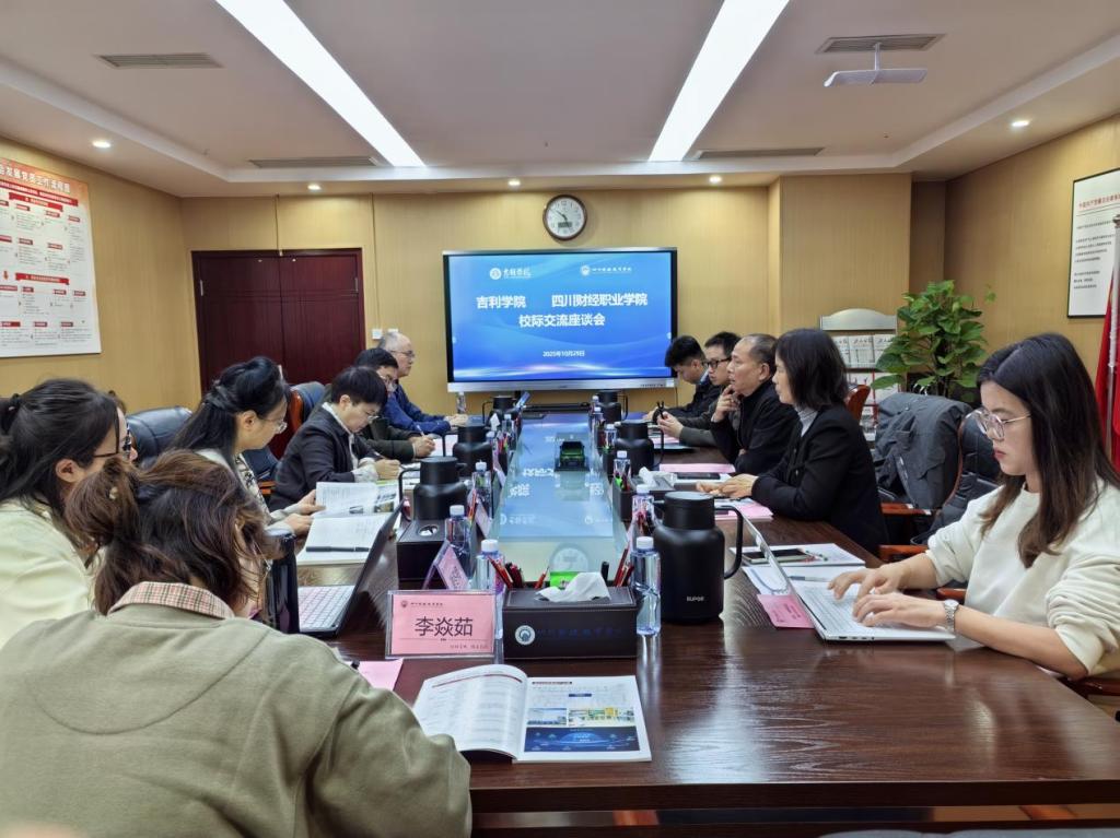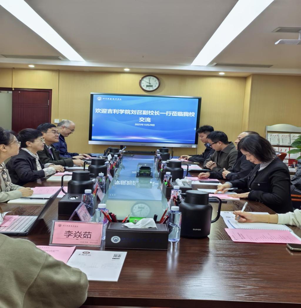 2025年10月29日,四川财经职业学院与吉利学院校际交流座谈会在明德楼912会议室举行,吉利学院刘召副校长一行5人莅临学校。学校党委委员、副院长李代俊及相关部门负责人出席了会议,会议由教务处处长李建军主持。