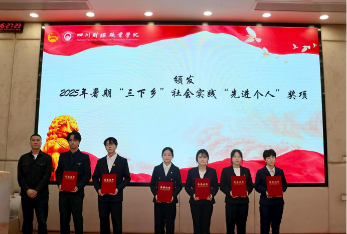 点评环节结束后,大会进入颁奖仪式。党委学生工作部副部长廖中强为2025年暑期“三下乡”社会实践“先进个人”获得者颁发奖项,团委书记、学生工作部副部长高菁为2025年成都第12届世界运动会“先进个人”获得者颁发奖状。