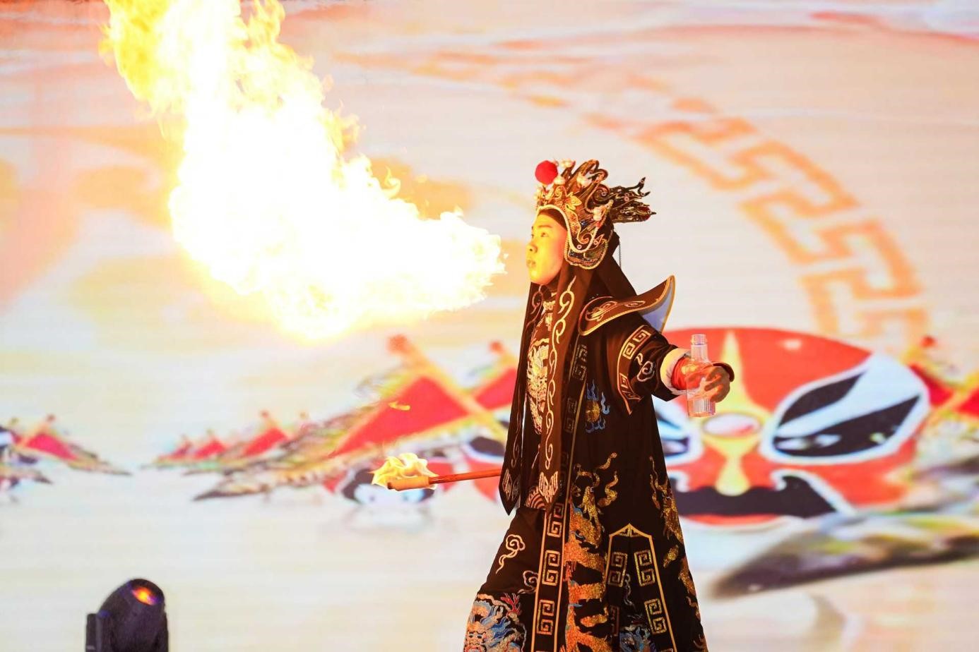 仪式现场,非遗展演融合传统底蕴与青春气息,精彩轮番上演。四川巾帼非遗传习中心带来的变脸喷火表演率先点燃氛围,五彩脸谱瞬息变换、烈焰腾空而起,将川剧艺术的奇幻魅力展现得淋漓尽致;古琴曲《流水》泠泠奏响,丝弦间流淌千年诗意,带领观众触摸古人的精神世界;《龙行十八式长嘴铜壶》茶艺表演更显惊艳,传承人手持长嘴铜壶,招式行云流水,完美融合茶之韵、力之美与艺之精。
