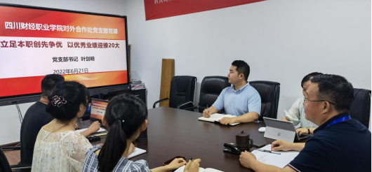 为全面贯彻习近平新时代中国特色社会主义思想,以优秀业绩迎接党的二十大胜利召开,对外合作处党支部于2022年6月21日在明德楼802室开展支部书记讲党课活动,会议由支部书记叶剑明主持,对外合作处党支部全体党员同志参会。