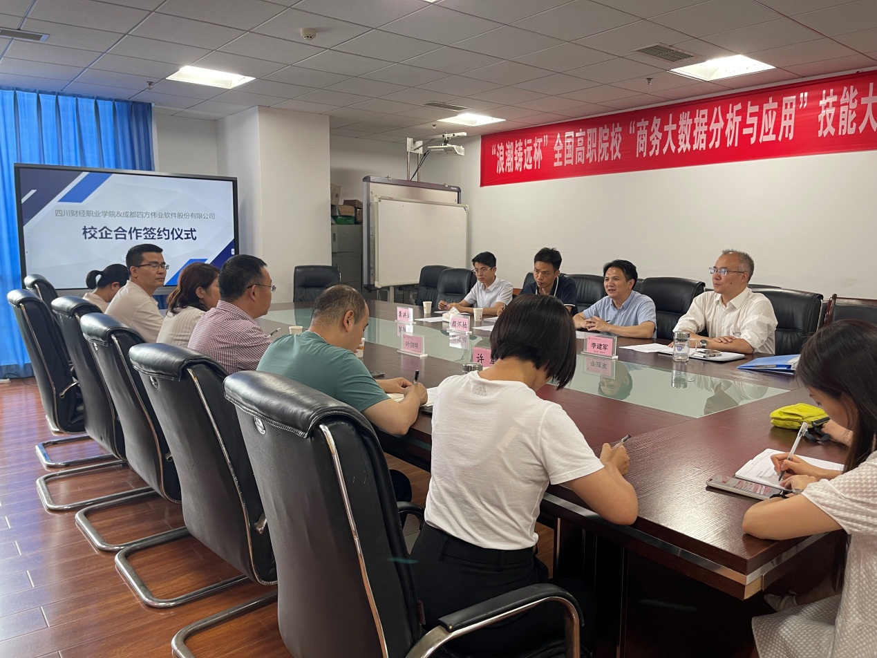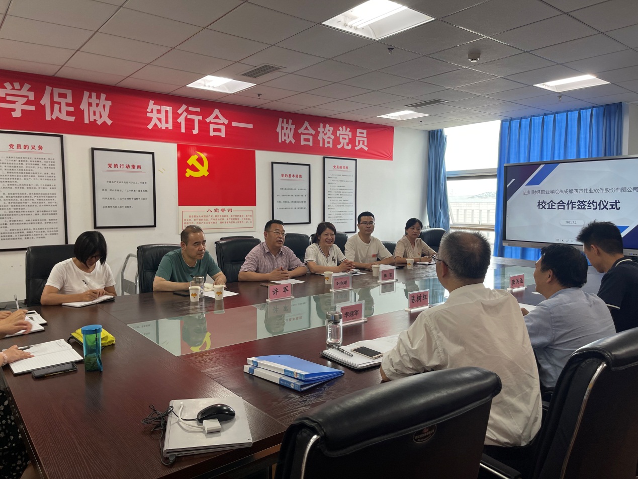 7月1日,在学院明德楼414会议室,我院与成都四方伟业软件股份有限公司举行校企合作签约仪式。四方伟业副总经理颜怀柏、副总经理陈树红、经理助理龚洪运,学院党委委员、副院长易思飞,对外合作处处长叶剑明,信息学院院长李建军,信息学院党总支书记傅丽,信息学院副院长许军及信息学院所有教研室主任出席活动。签约仪式由信息学院院长李建军主持。