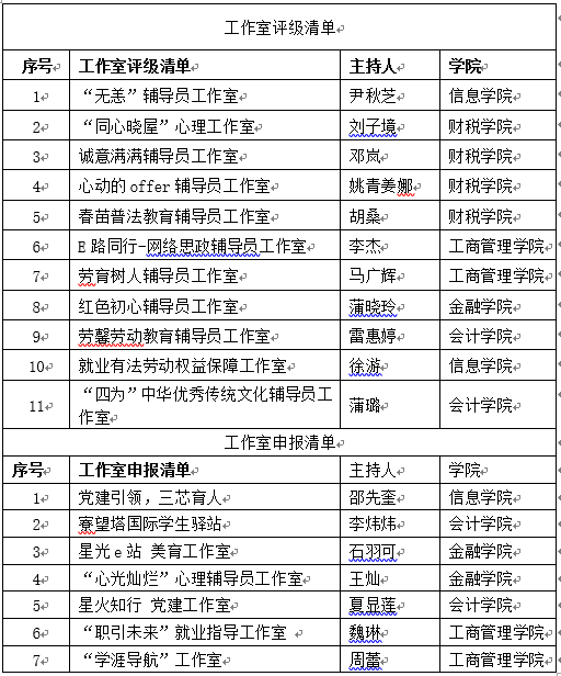 为强化辅导员队伍专业化建设,发挥工作室在学生教育管理服务中的示范作用,依据《四川财经职业学院辅导员工作室建设与管理办法》,学校于 2025 年11月启动前三批辅导员工作室评级和第四批申报工作,现将评级和申报材料公示如下: