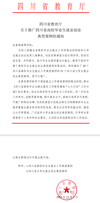 2025年12月7日,四川省教育厅印发《关于推广四川省高校毕业生就业创业典型案例的通知》,我院2022届电子商务专业毕业生、理县塔斯村“大山邻居”生态养殖专业合作社理事长徐斯嘉的返乡创业事迹成功入选,成为51个“四川省大学生就业创业典型案例”之一,也是全省唯一以民宿融合模式带动高原村落增收的范本。