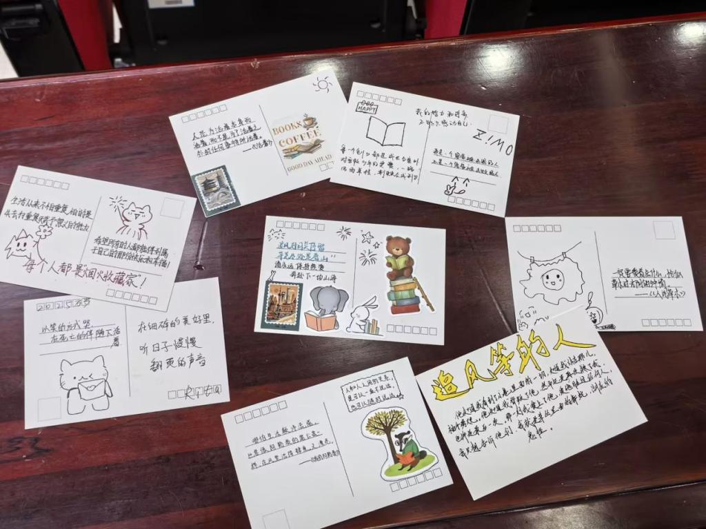 分享环节结束后,现场开启了别开生面的创意明信片互动。学子们手持精心准备的明信片、画笔及主题贴纸,将书中的金句和阅读感悟转化为生动的文字与涂鸦,或是摘录触动心灵的经典箴言,或是抒发独属于自己的心灵共鸣。思想的火花在面对面的交流中不断迸发,原本孤独的阅读过程,就此变成了一场温暖的共享之旅。