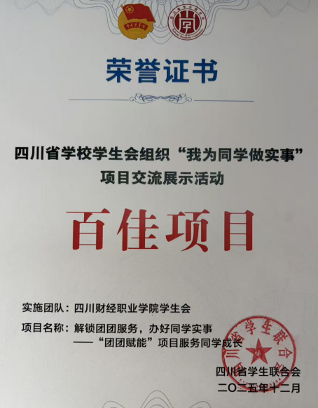为发掘推广优质服务项目,推动学生会组织提质增效,12月14日至15日,由共青团四川省委、四川省学生联合会主办的2025年四川省学校学生会组织“我为同学做实事”项目交流展示活动在西南石油大学新都校区成功举办。我校学生会牵头打造的“团团赋能”服务同学项目,从全省318个项目中脱颖而出,经过评审、答辩、展示等环节,凭借扎实的服务成效、鲜明的创新特色与广泛的学生认可,成功入选全省“百佳项目”。