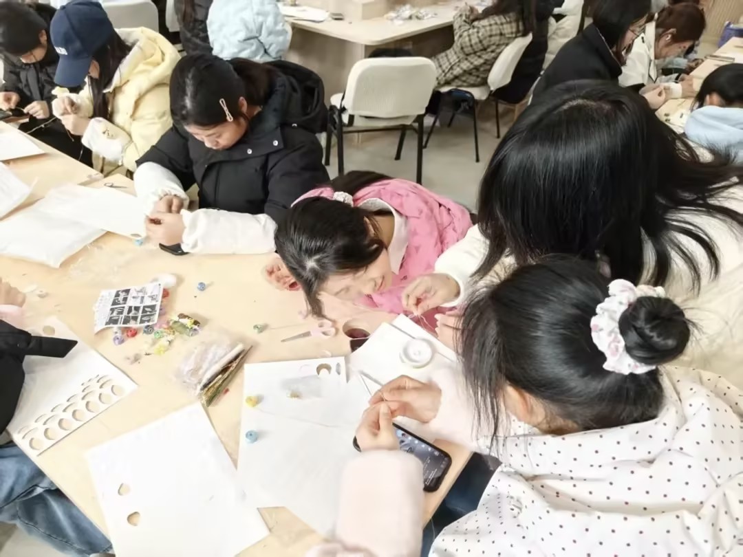 过程中,学员们相互交流技巧、分享心得,遇到难题及时请教,活动现场充满欢声笑语。许多同学第一次接触缠花技艺,看似简单的缠绕却暗藏门道,完成作品的那一刻特别有成就感,也让大家感受到了传统文化的博大精深。进一步加深了同学们对传统技艺的认知。