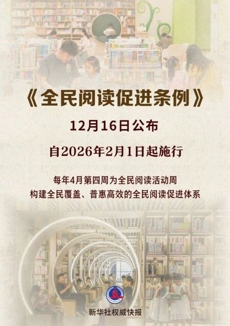 2025年12月9日,国务院总理李强签署国务院令,正式公布《全民阅读促进条例》,并定于2026年2月1日起施行。条例旨在促进全民阅读,推进书香社会建设,这标志着我国全民阅读事业迈入了有法可依、规范促进的新阶段。全文如下: