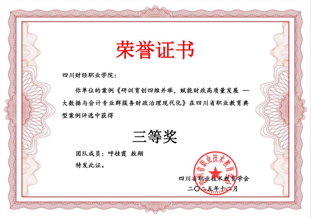 近日,四川省职业技术教育学会公布了职业教育典型案例评选结果。会计学院报送的由呼桂霞、敖翔等教师完成的案例《研训育创四维并举,赋能财政高质量发展——大数据与会计专业群服务财政治理现代化》荣获三等奖。