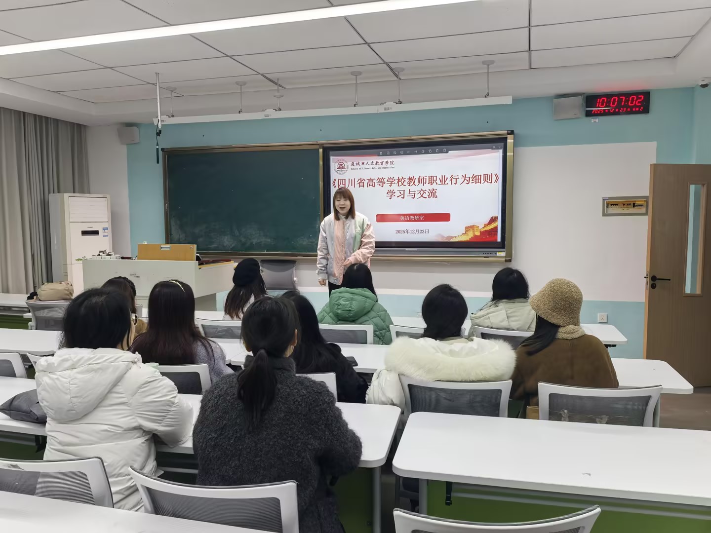 为深入落实上级教育部门及学校师德师风建设工作部署,提升教师思想政治素质与职业素养,2025年12月23日上午,通识与人文教育学院英语教研室在教研室主任李妍妍老师带领下,开展《四川省高等学校教师职业行为细则》(以下简称《细则》)专题学习研讨会,以“学细则、守底线、正师风”为核心,推动职业规范内化于心、外化于行。