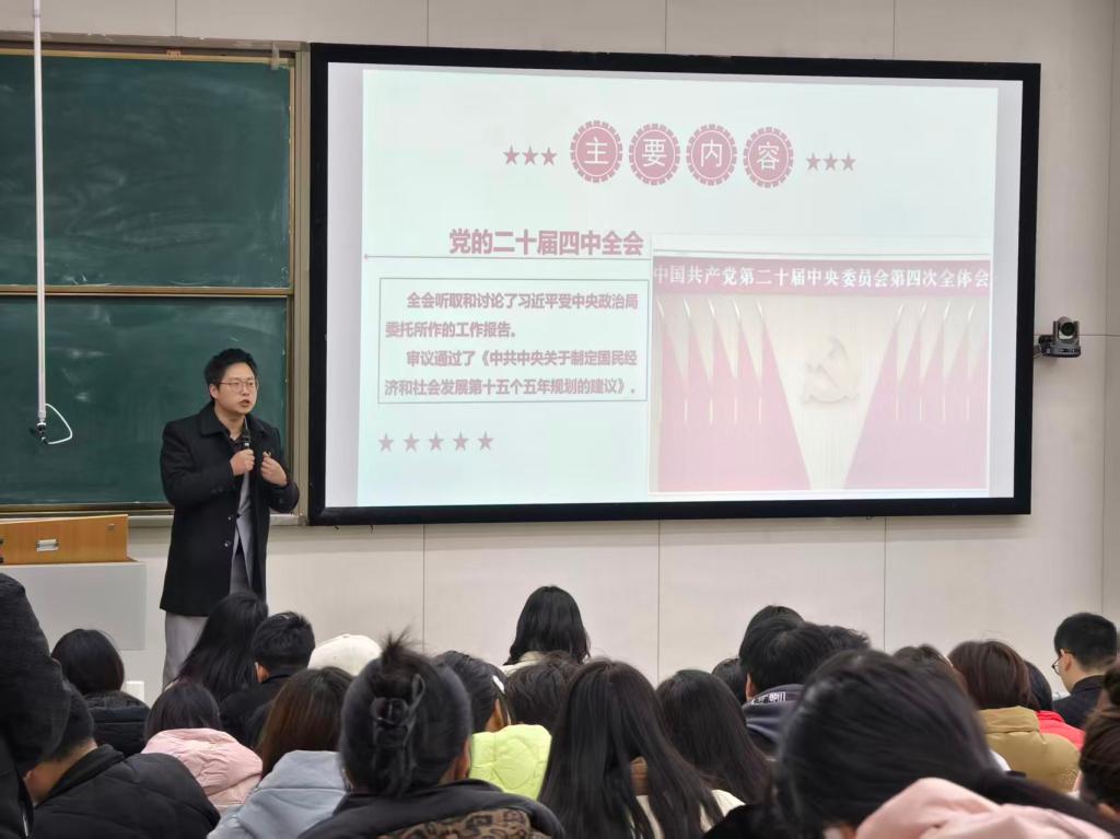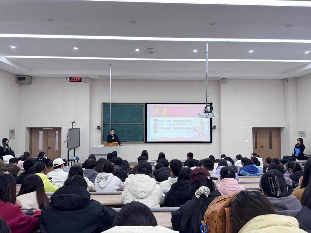 会上,杨斌博士围绕全会精神,系统阐释了“十四五”时期我国经济社会发展取得的重大成就,并结合财经类专业特点,深入解读了“十五五”规划的战略意义、形势判断与行动纲领。他重点分析了当前我国发展环境的基本特征,剖析了中国式现代化在高质量发展、现代化产业体系建设、高水平对外开放等方面的实践要求,引导师生从历史方位和时代使命中把握财经领域在服务国家战略中的责任与担当。