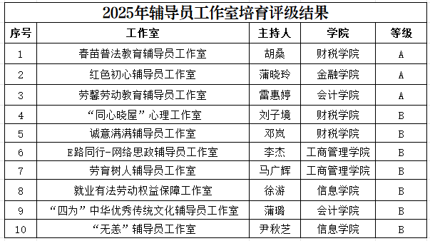 根据《四川财经职业学院辅导员工作室建设与管理办法》(川财职院行〔2021〕137号)》《关于开展第四批辅导员工作室培育项目申报暨前三批辅导员工作室评级认定工作的通知》(川财职院学工〔2025〕101号),经自主申报、资格审查、专家评议,现将2025年度校级辅导员工作室评级和申报培育的结果予以公示。