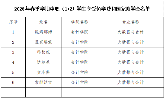 根据《关于全面实行中等职业教育免学费政策进一步完善国家助学金制度的通知》(川财教【2012】298号)、《学生资助资金管理办法》(财教【2021】310号)、《四川省财政厅 四川省教育厅四川省人力资源和社会保障厅关于转发调整高等教育阶段和高中阶段国家奖助学金政策的通知》(川财教〔2024〕121号),2026年春季学期我校符合条件的中职(1+2)学生共6人,中职阶段享受免学费(5280元/年)及国家助学金(2300元/年)。