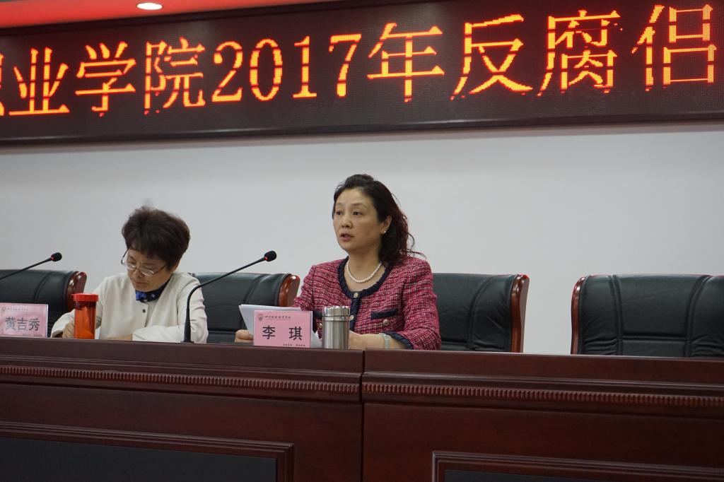 对2017年学院党风廉政建设工作,李琪强调,要强化党内监督,推进标本兼治,大力实践监督执纪“四种形态”,严肃查处群众身边的不正之风和腐败问题,坚定不移推进党风廉政建设和反腐败斗争,巩固风清气正的育人环境,开创学院党风廉政建设和反腐败工作新局面。重点做好以下四个方面的工作:一是要切实担负管党治党政治责任,认真落实党委主体责任和纪委监督责任,切实履行“一岗双责”,严格责任追究,党员领导干部要带头树牢“四个意识”,严格遵守廉洁自律准则和“六项纪律”;二是要坚持不懈加强作风建设,紧紧盯住收送红包礼金、违规发放津补贴、公款吃喝、公款旅游、违规办理婚丧喜庆事宜和文山会海等老问题,严肃查处群众身边的不正之风和腐败问题;三是大力实践“四种形态”,在抓前、抓早、抓小上下足功夫,让红脸出汗成为常态,加大谈话函询力度,用好诫勉、组织处理等方式,按照《院党委书记、纪委书记约谈系部处室主要负责人暂行办法》进行廉政约谈,开展提醒警示,坚持反腐败无禁区、全覆盖、零容忍;四是要完善惩防体系建设,建立起一级抓一级、层层抓落实的责任体系和工作格局,要着力抓好个人有关事项报告、离开工作地区报告、因私出国(境)报告、领导干部操办婚丧嫁娶喜庆事宜等工作,加大督促检查力度;五是要健全制度强化监督,建立和实施内部控制制度,对学院工作风险进行事前防范、事中控制、事后监督和纠正的动态过程和机制,继续加强对基建工程、物资采购、财务管理、人才招聘、干部选拔、评优评先、招生录取等的监督工作;六是要强化纪检队伍自身建设,要加强纪检监察组织建设和队伍建设,加强对纪检干部的教育、培训和交流力度,切实提高其综合素质和履职能力,坚决维护队伍的先进性纯洁性,建设一支让党放心、干部职工信任的纪检队伍。