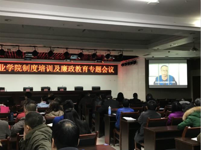 2016年12月13日下午,学院召开了“制度培训及廉政教育会议”,参加会议的有副院长李跃进、纪委书记李琪、副院长易思飞以及学院全体中层干部、涉及“三重一大”事项的重点部门重要岗位工作人员。会议由李琪主持。