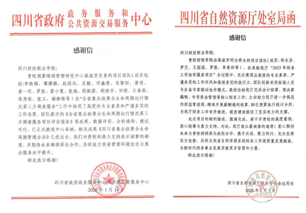 新年伊始,捷报频传。 2026年开年之际,四川财经职业学院在产教融合与社会服务领域交出亮眼“成绩单”:1-2月签订绩效服务合同金额近200万元,成功实现“开门红”。与此同时,多封来自合作单位的感谢信纷至沓来,对学院团队的专业素养与服务成效给予了高度评价。2025年为某单位提供事前绩效评估服务,实现超20%资金节约(2900余万元),卓越的服务质量赢得了合作方的高度信任,今年成功续约并签订3年服务合同。这一系列成果的背后,是学院产教融合创新实践正在开花结果。